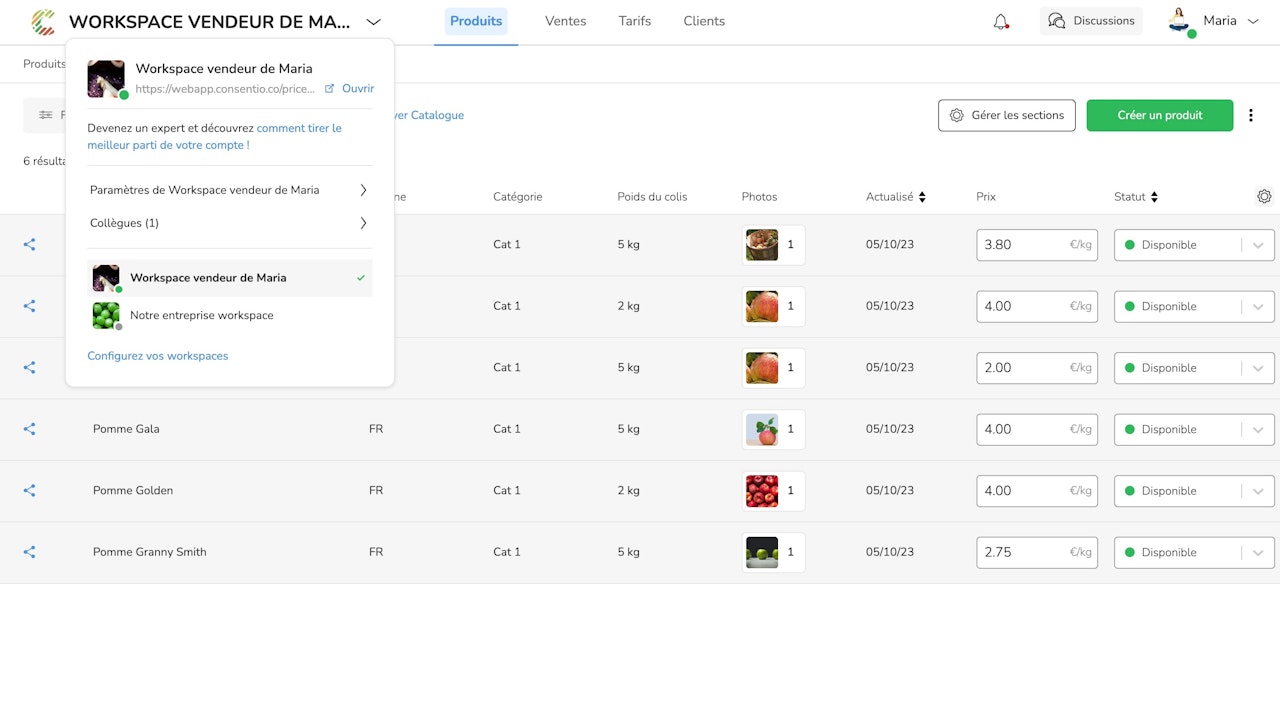 Vous pouvez être ajouté sur un second Workspace celui de votre entreprise. Pour activer à la vente les produits de votre entreprise, vous devrez sélectionner le Workspace de votre entreprise comme celui par défaut.