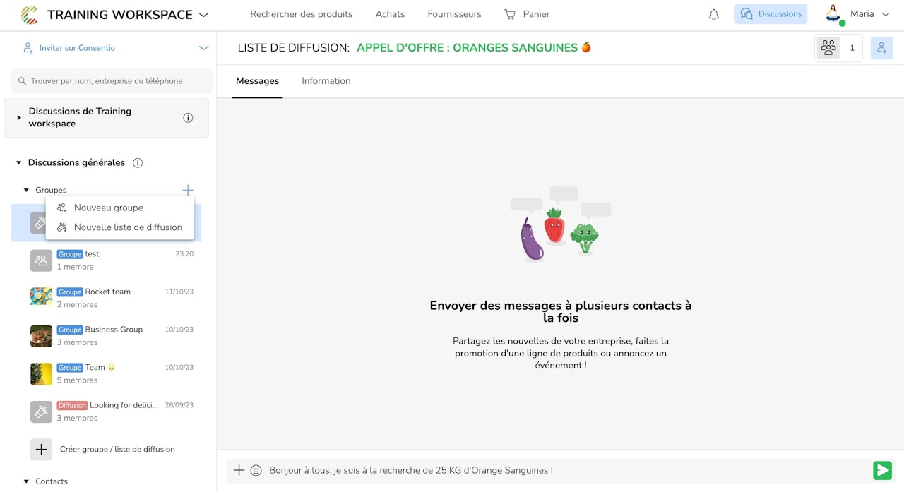 Si vous recherchez un type de produit spécifique auprès de vos fournisseurs, vous pouvez envoyer une liste de diffusion à tous vos fournisseurs pour leur demander des informations complémentaires.