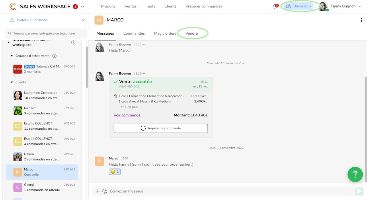 Une autre possibilité est de sélectionner directement votre client dans l'espace Discussions et cliquez sur Vendre pour accéder à votre catalogue.