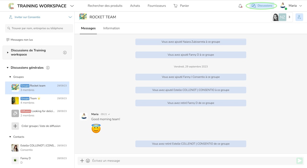 Pour inviter de nouveaux contacts sur Consentio, rendez-vous dans "Discussions Générales" puis "Contacts".