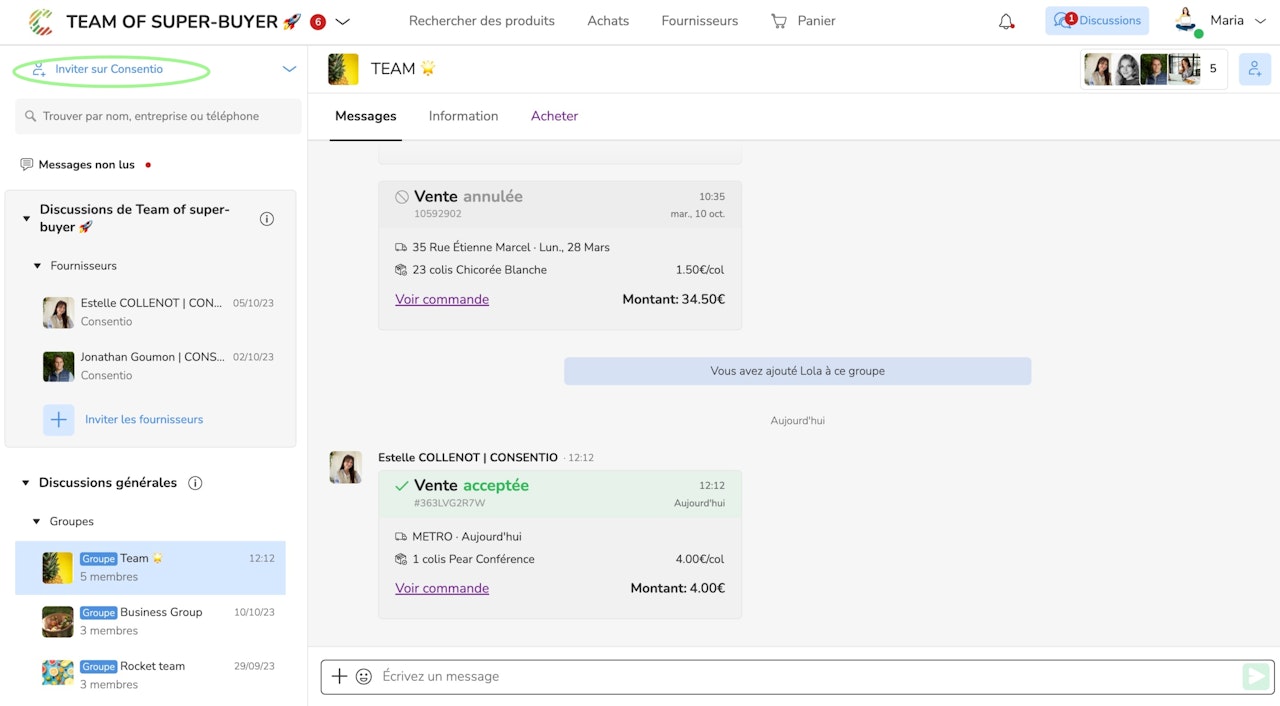 Pour inviter vos contacts sur Consentio, rendez-vous dans Discussions puis cliquez sur le bouton Inviter sur Consentio (vous retrouvez également le bouton Invitez vos contacts bas de votre section Contacts).