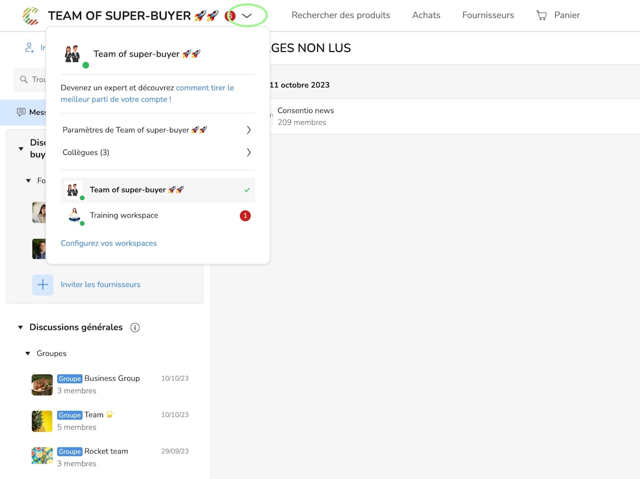 Tout d'abord, cliquez sur votre section Workspaces et vous verrez votre workspace et votre workspace des achats activés.