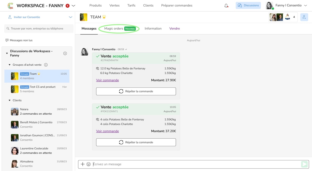 2. Dans les discussions avec votre client (ou au sein d'un notre groupe d'achat-vente), sélectionnez le bouton Magic Orders.